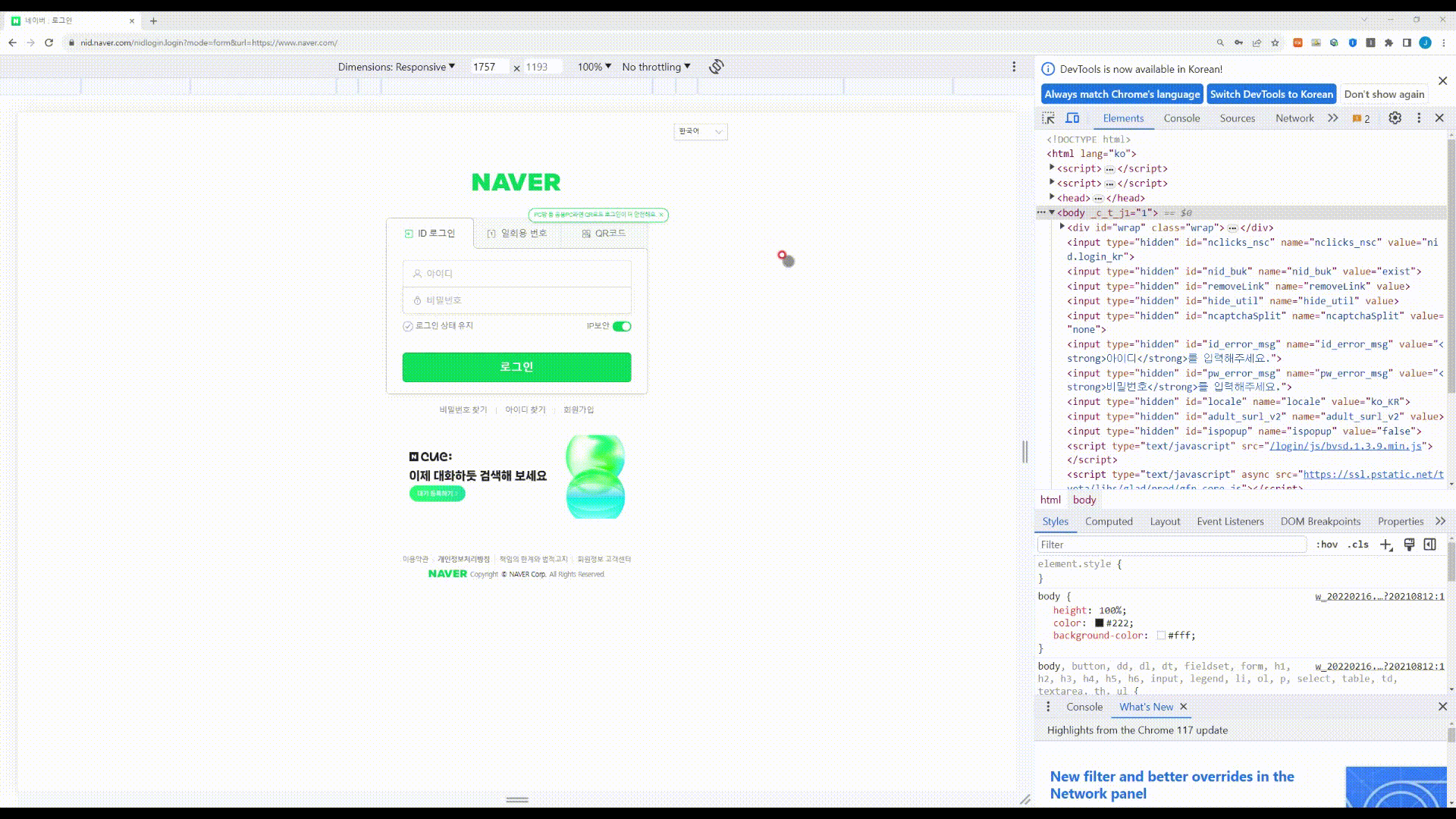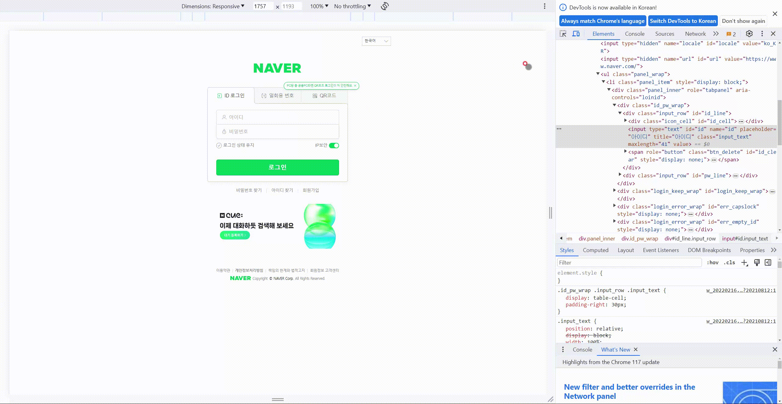 아이디 입력창을 클릭하기 위해서는 CSS_Selector의 요소가 필요하다. 위에서 한것 처럼 개발자도구를 열어서 아이디와 비밀번호의 Selector 요소를 찾아보자.