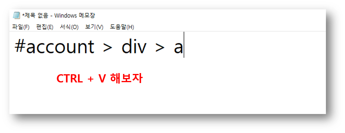 메모장을 열어 CTRL+ V 해보면 #account > div > a 과 같은 코드가 복사 된것을 알 수 있다. 이것이 네이버 로그인 버튼의 주소(?)라고 생각하자.
