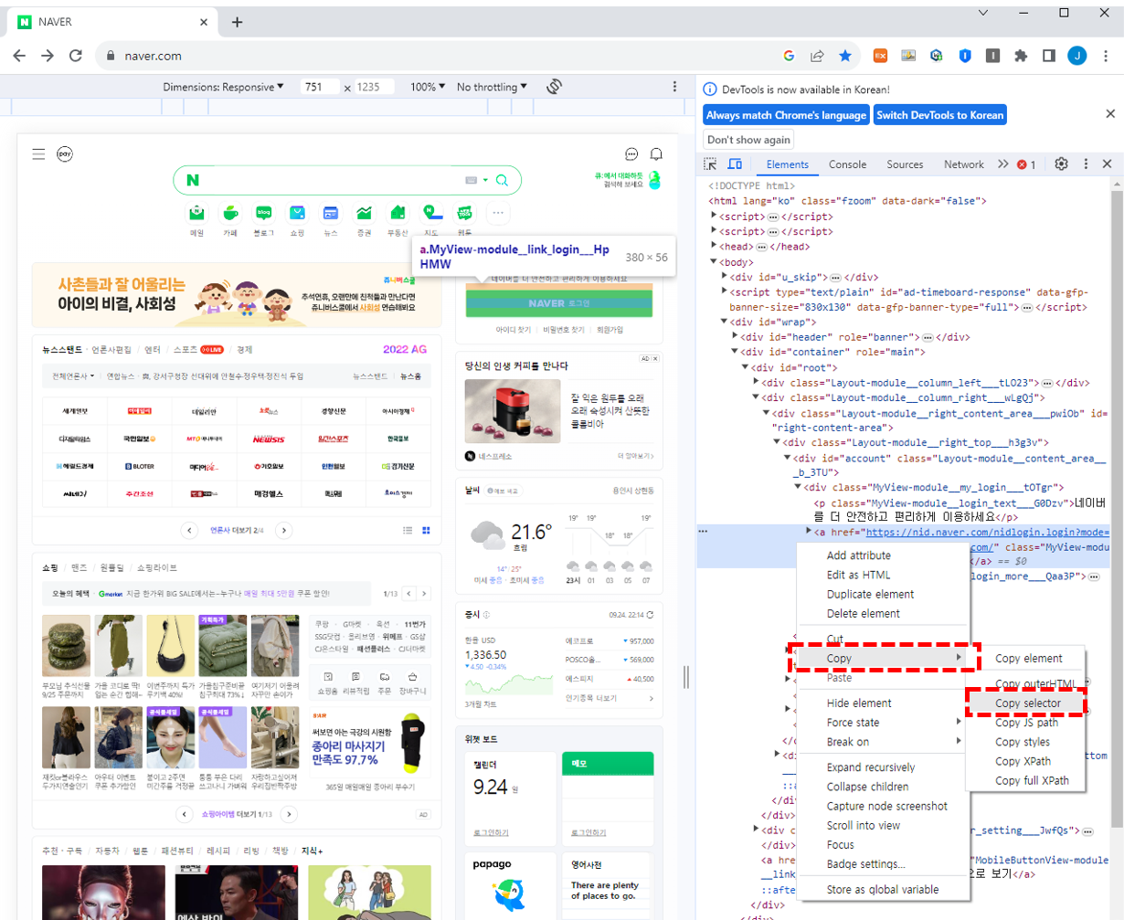 개발자 도구에서 선택된 HTML 코드를 우클릭 - Copy - Copy Selector 이렇게 하면 주소(?)가 복사된다.