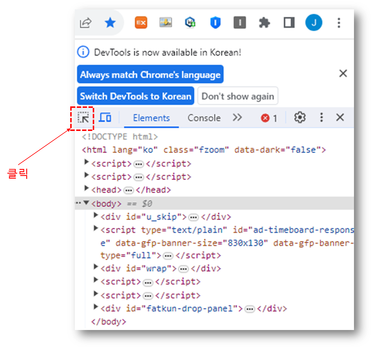 F12키를 눌러주면 오른쪽에 개발자 도구 창이 나타난다. 개발자 창에서 아래의 화면에 보이는 버튼을 클릭하자.
