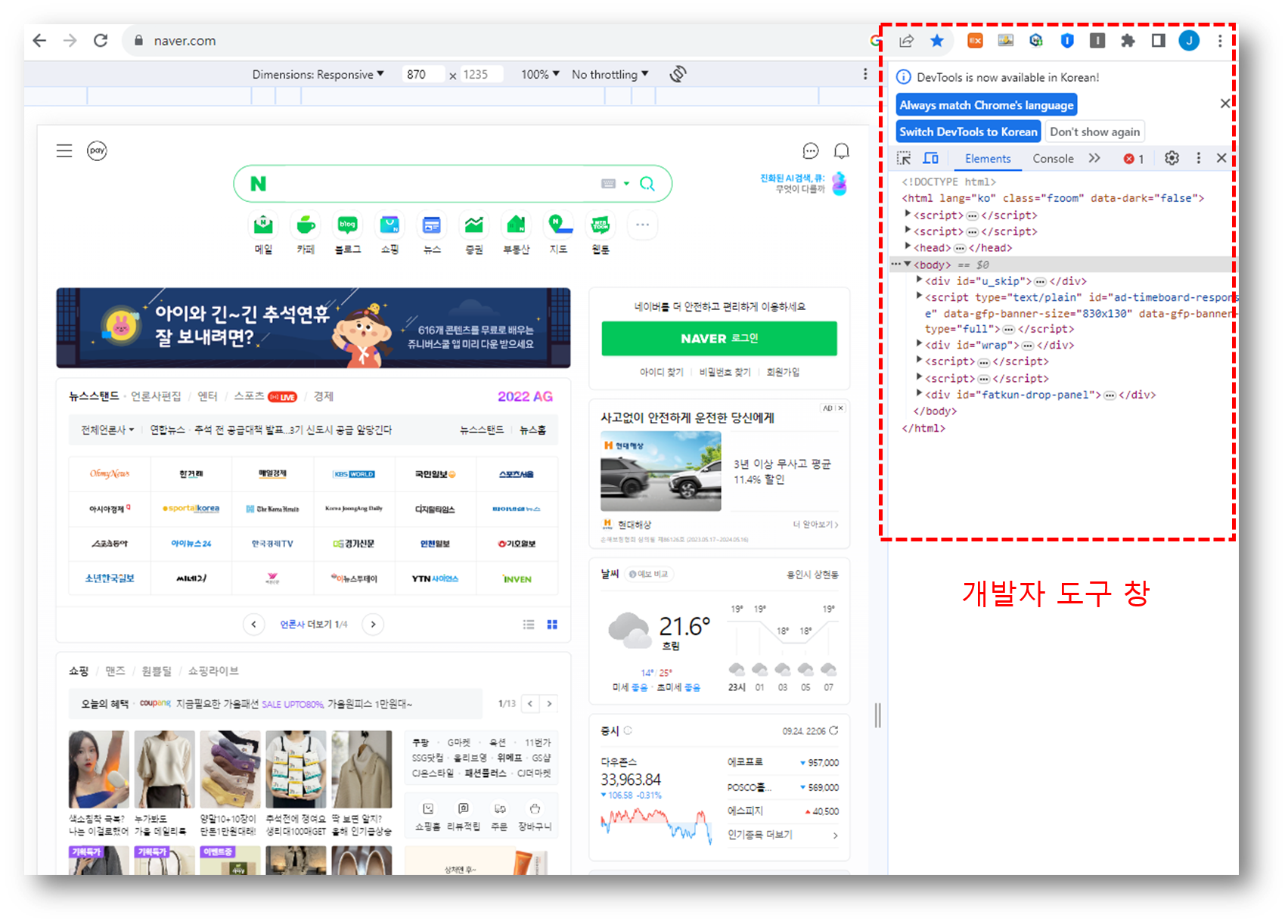 주소를 찾기 위해서는 개발자 도구가 필요하다. 개발자 도구는 F12 키를 눌러서 열 수 있다.