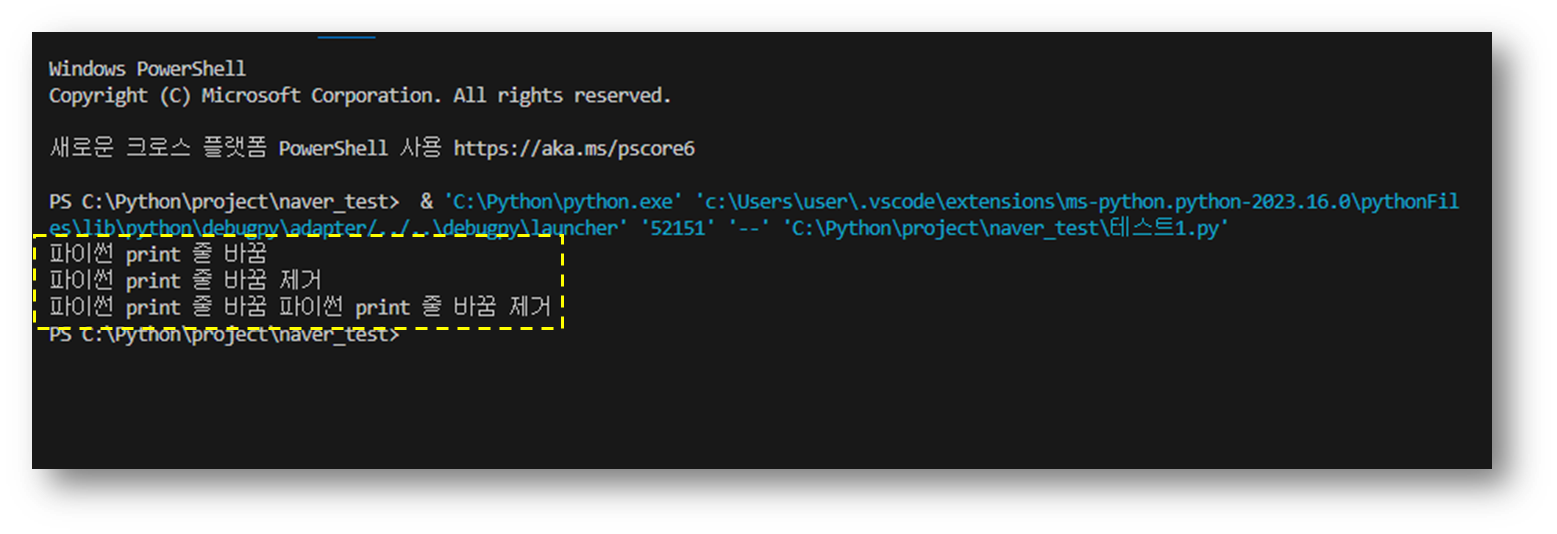결과는 VScode의 터미널창에서 아래와 같이 나올 것이다.