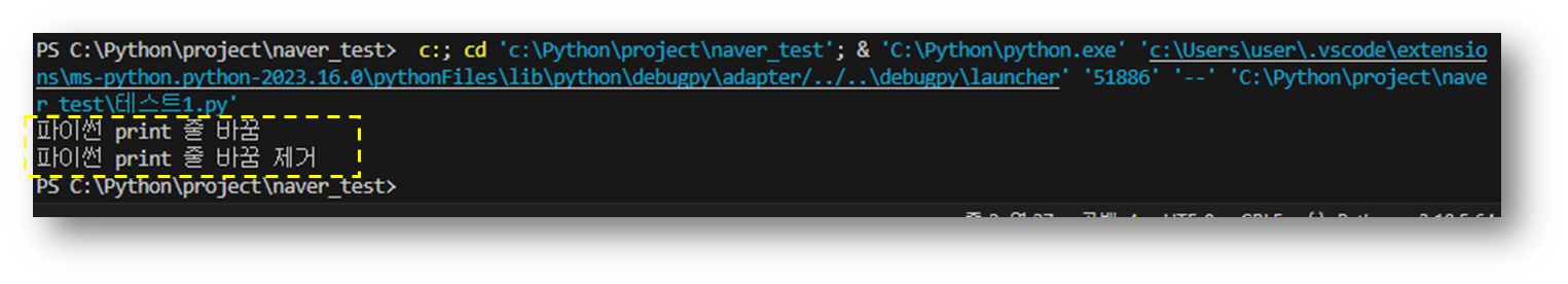 결과를 보면 \n이 없는데 줄이 바뀐것을 알 수 있다. 그렇다. print 함수는 자체적으로 줄 바꿈을 해버리는 것이다. print 함수는 종료될때 자동으로 줄 바꿈을 한다는 것을 알 수있다.