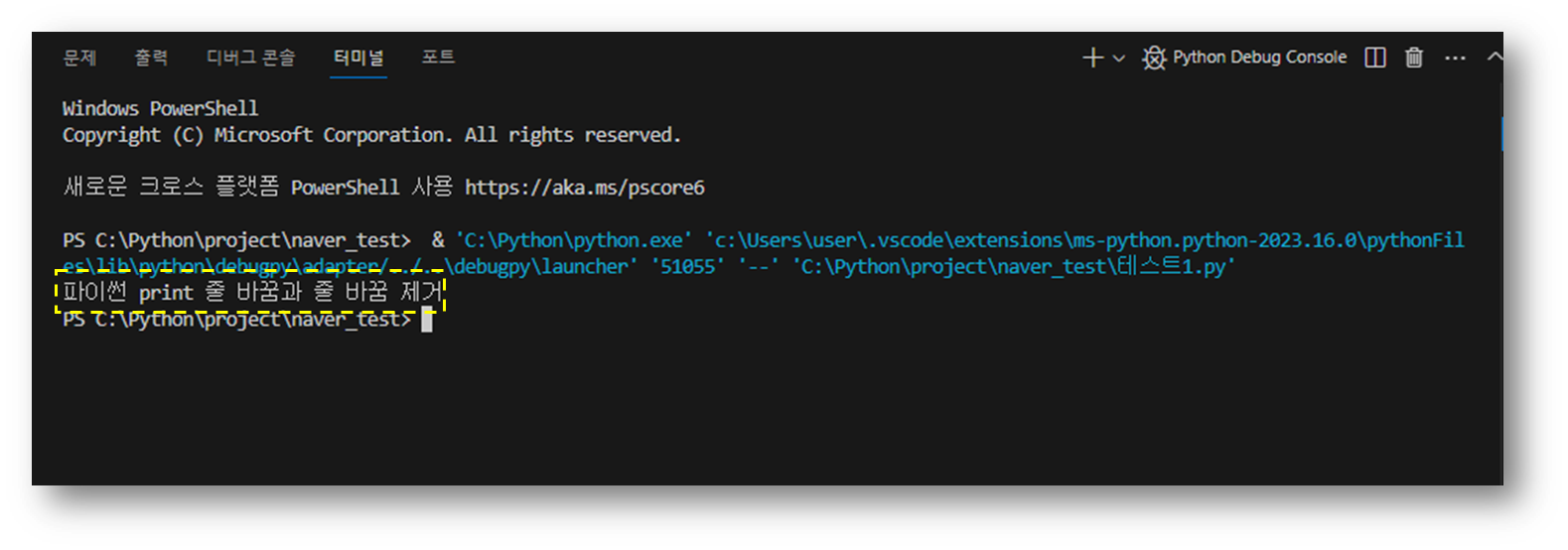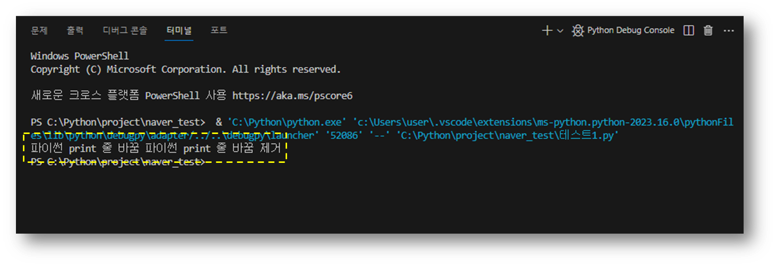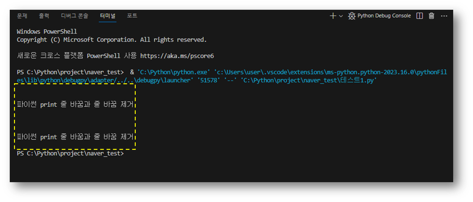 이렇게 하나의 print 함수를 사용하여 문자열 앞뒤로 "\n" 을 넣어 주면 된다. 결과를 살펴 보자.