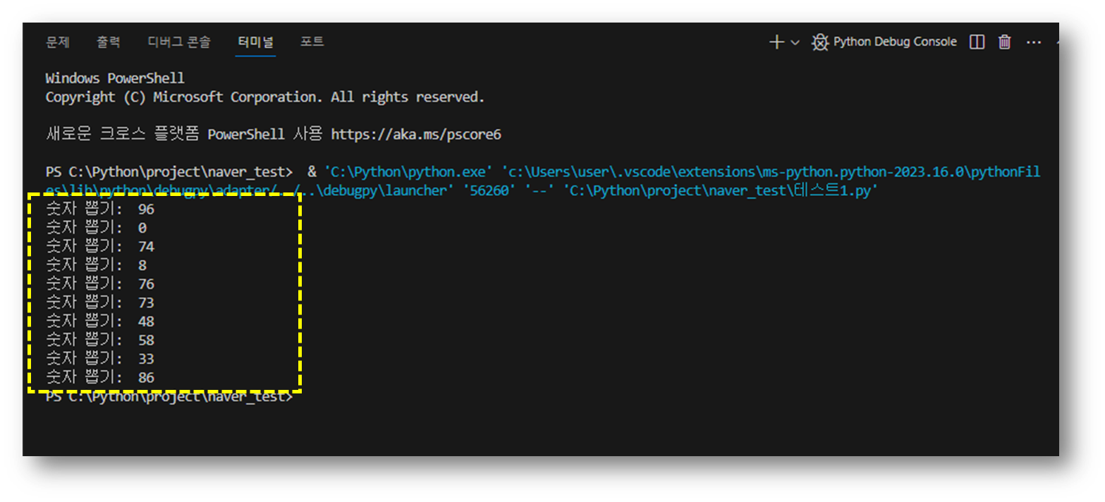 randint(0,100) 여기서 0과 100은 숫자의 범위이다. 원하는 범위의 숫자 2개를 입력하고 실행해 보자.