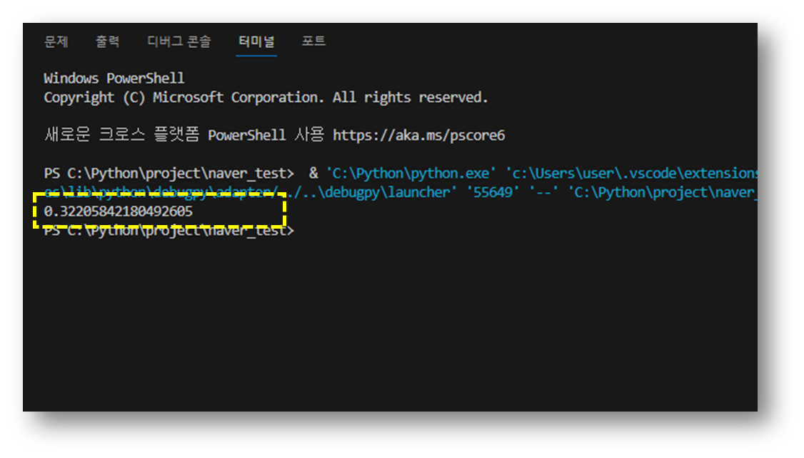 매번 다른 값이 나오기는 하지만 소수점 자리가 나오고, 아마 0에서 1사이의 소수점 자리가 까지 나오는것을 알 수 있다.