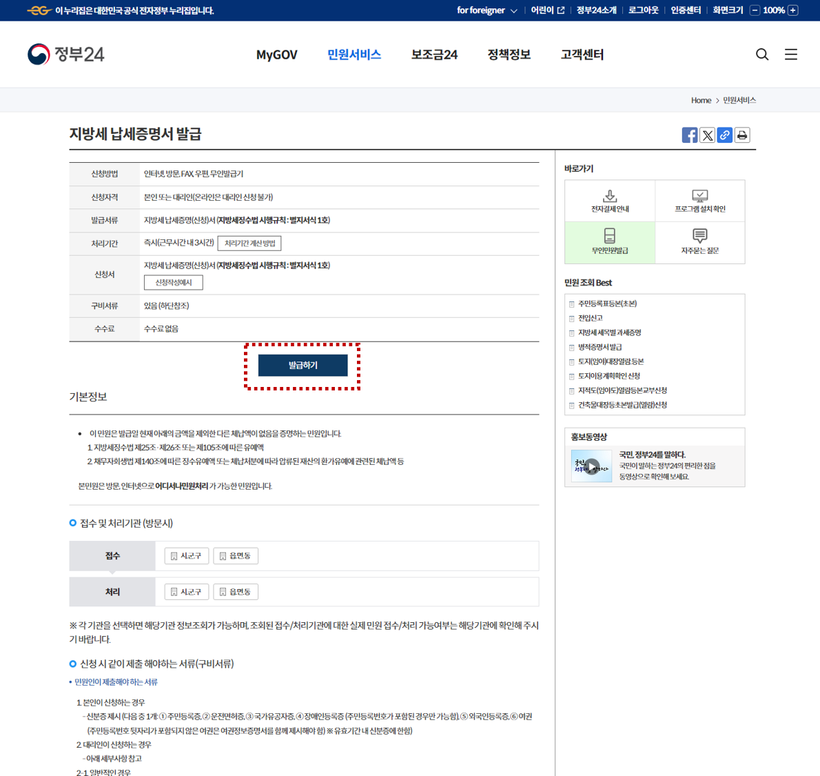 지방세 납세증명서 발급 페이지로 넘어갈 것이다. 여기서 스크롤을 내려 신청내용 화면으로 이동하자.