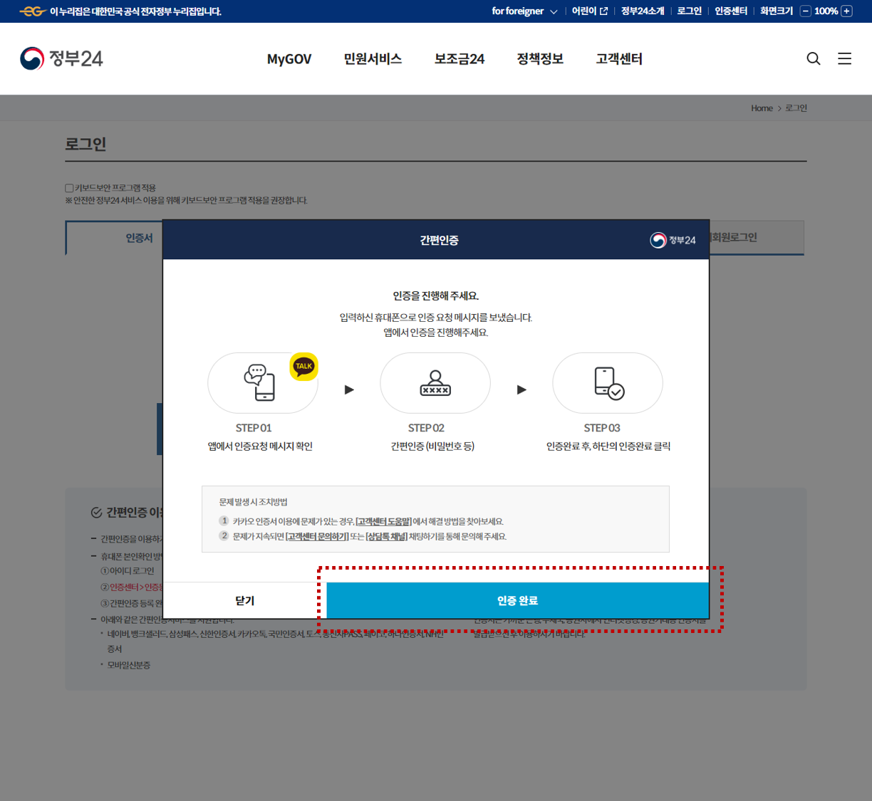 그럼 아래와 같이 나타나고, 카카오톡을 통하여 인증이 완료되면 인증완료 버튼을 누르면 된다.