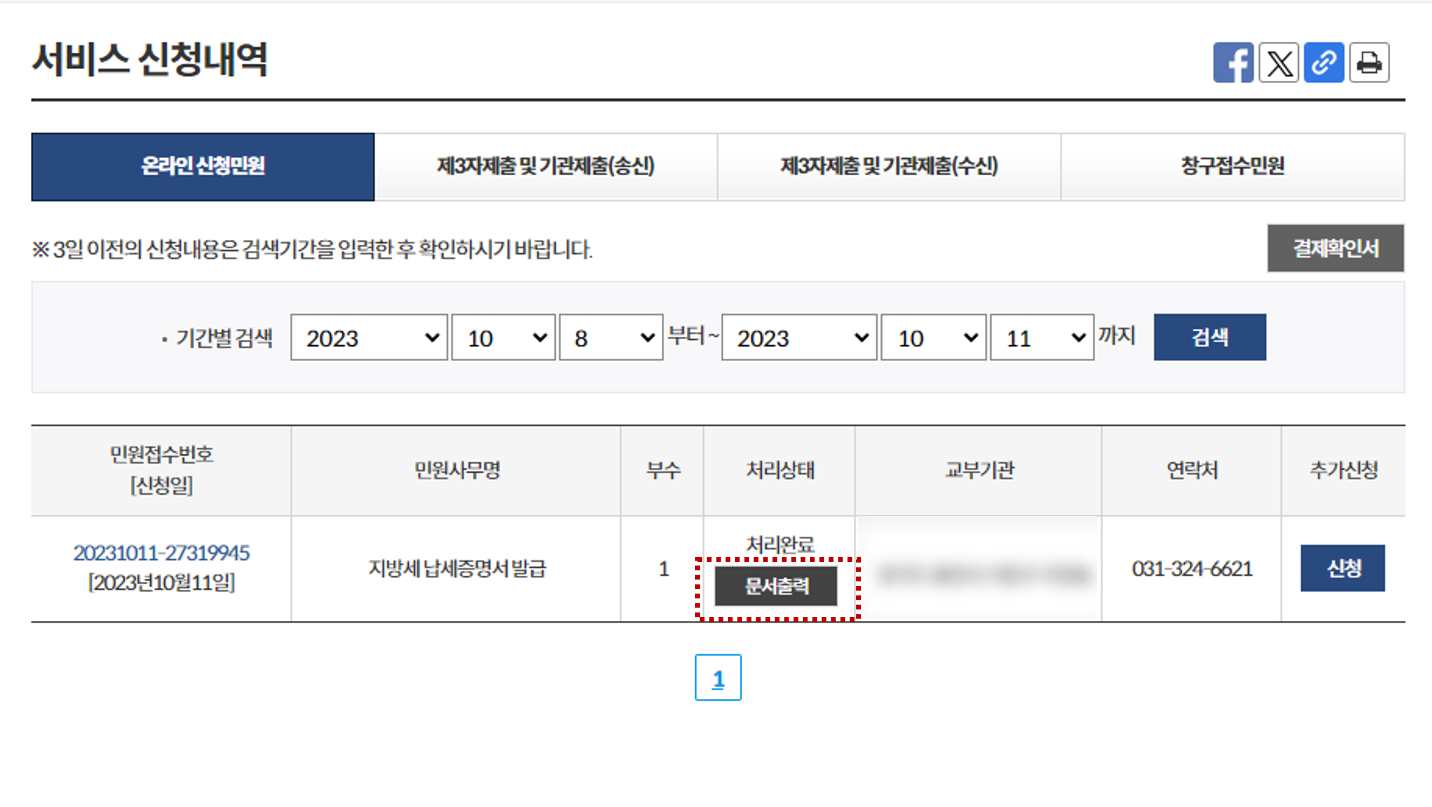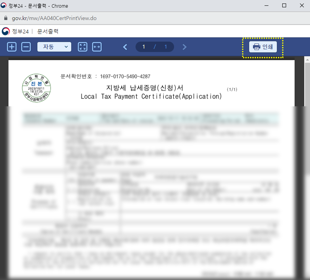 체납된 지방세를 납부하자 마자 다시 확인해보니 문서를 출력할 수 있게 되었다. 문서 출력 버튼을 눌러보자.