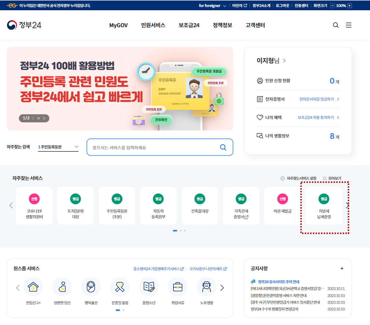 정상적으로 로그인이 완료되었다면 아래와 같이 화면이 나타날 것이다. 자주찾는 서비스에서 지방세 납세증명 메뉴를 클릭하도록 하자