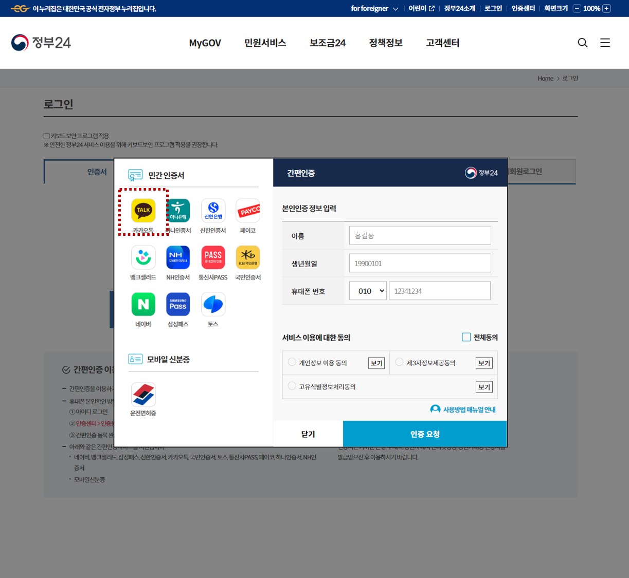 카카오톡을 선택하고 본인정보를 입력한뒤 인증요청을 보내자.