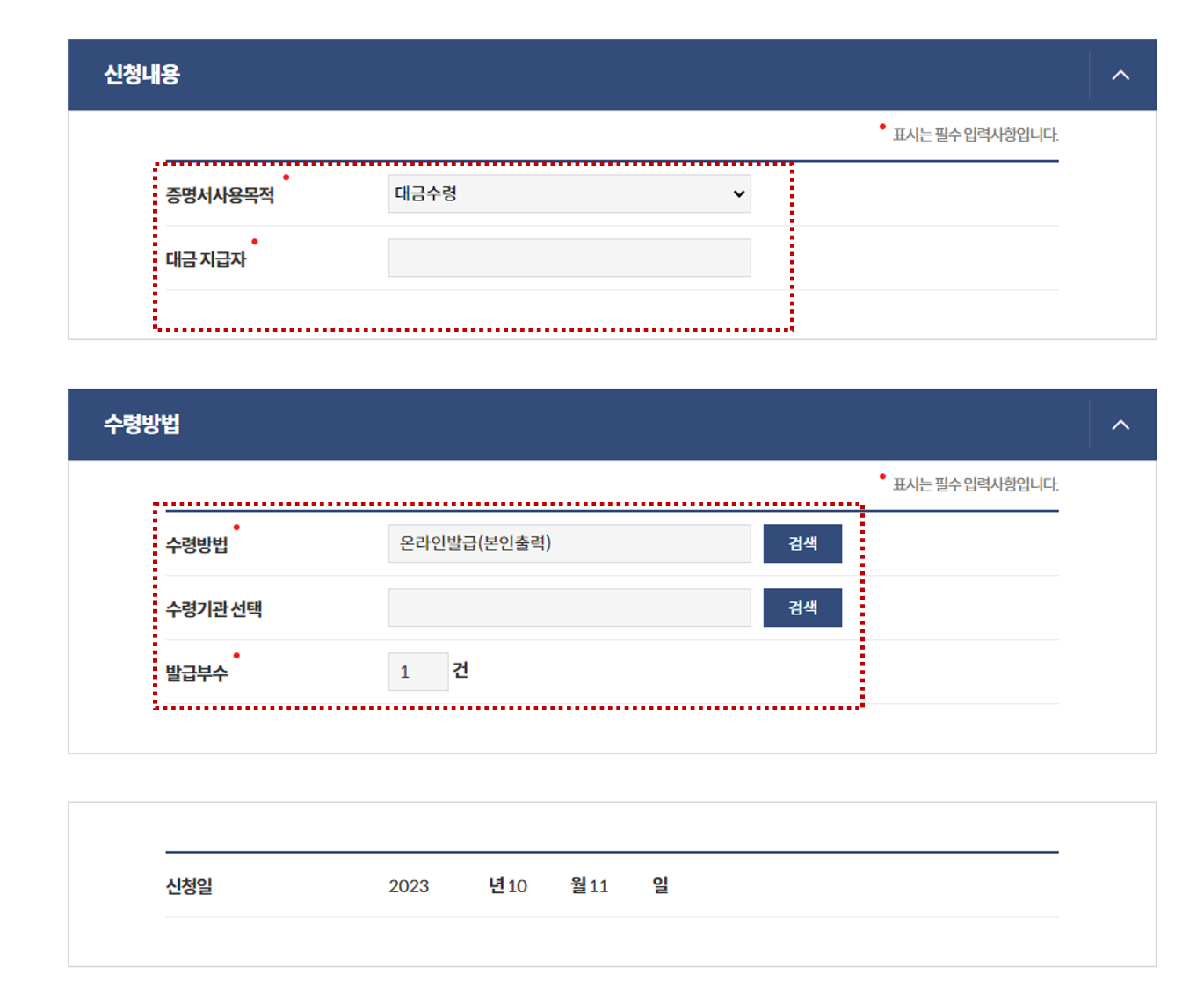 신청 내용은 대급수령 ( 다른 사유가 있다면 선택) 으로 하고, 대급지급자는 서류를 요청한 기관의 이름을 작성하면 된다.