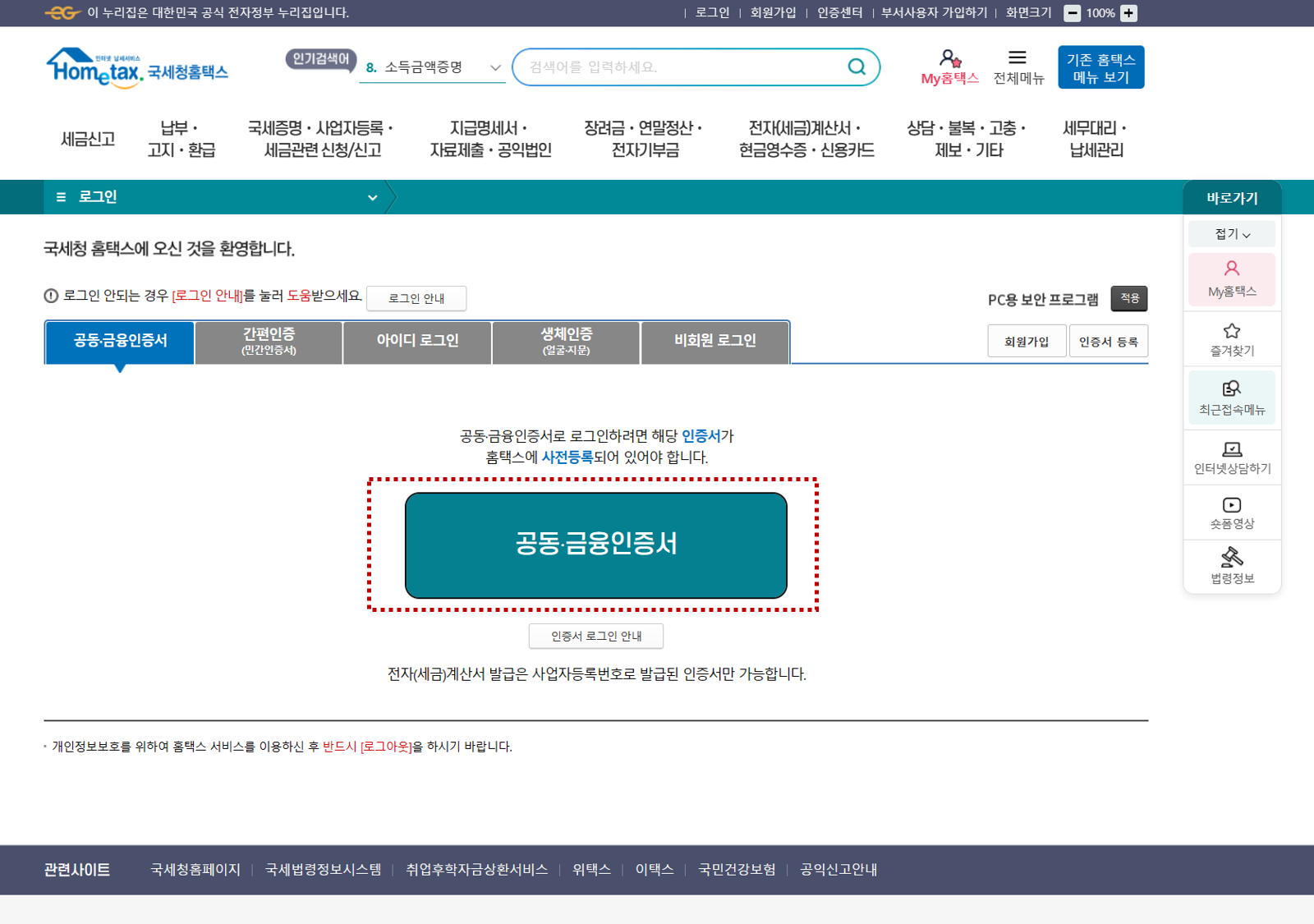 먼저 공동, 금융인증서가 홈택스에 등록이 되어 있다면 공동, 금융인증서 버튼을 클릭해보자.