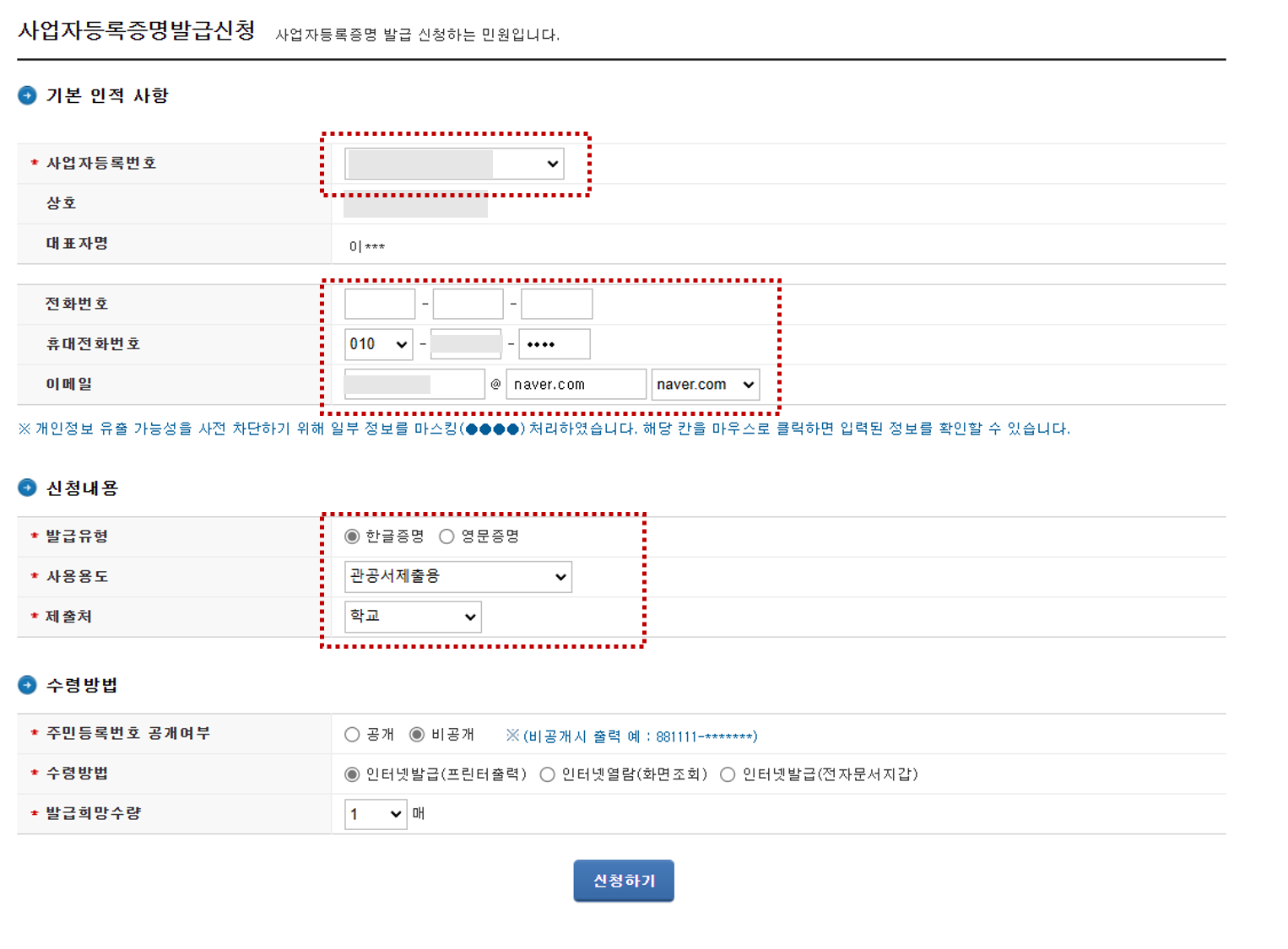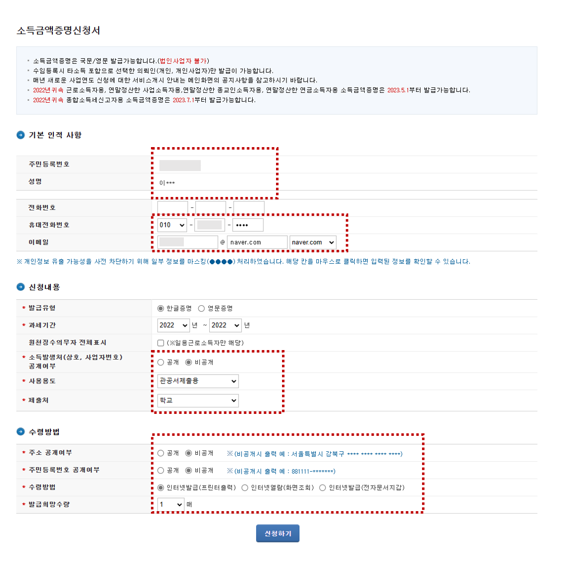 주소나 주민등록번호는 공개 안해도 되니 비공개로 선택하자. 그리고 수령방법은 인터넷발급을 선택하고 신청하기 버튼을 누르면 끝난다.