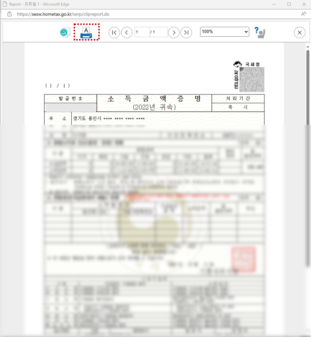 출력 버튼을 누르면 이렇게 소득금액증명원이 나타난다. 위쪽 출력 버튼을 눌러 출력을 하던지 PDF로 저장하면 끝난다.