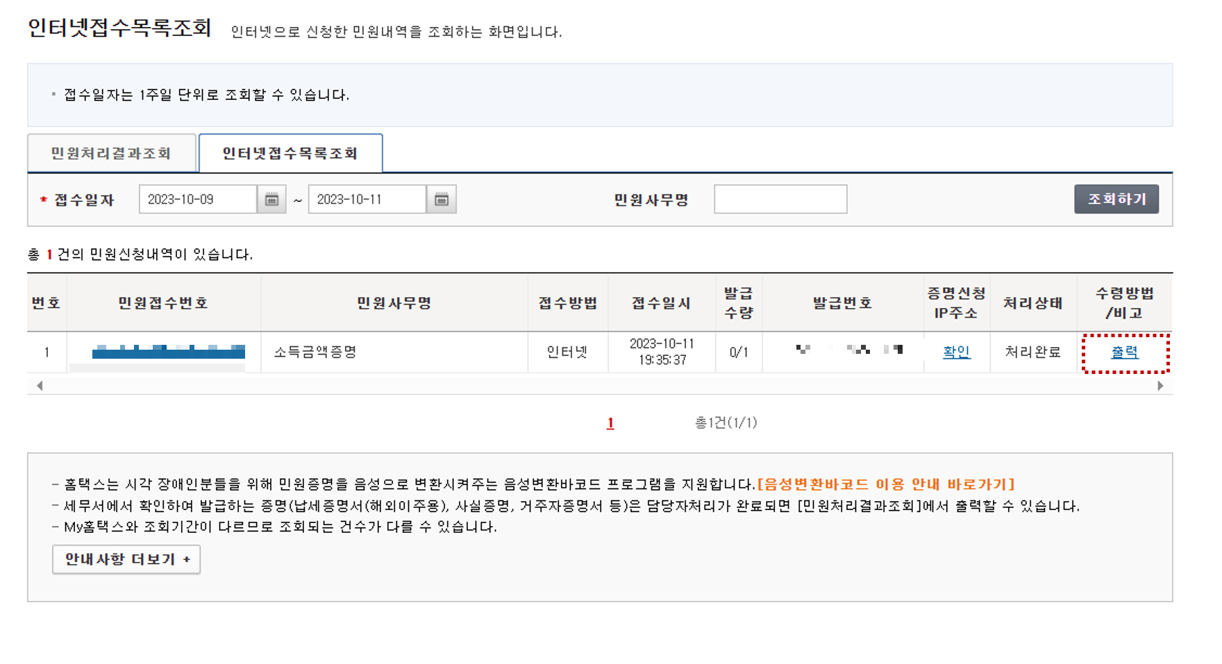 신청과 동시에 출력이 가능하다. 다음 나오는 화면에서 출력 버튼을 눌러주자