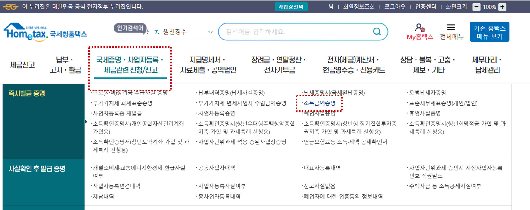 국세청 홈택스 소득금액증명원 및 사업자등록증명원 인터넷 발급 방법