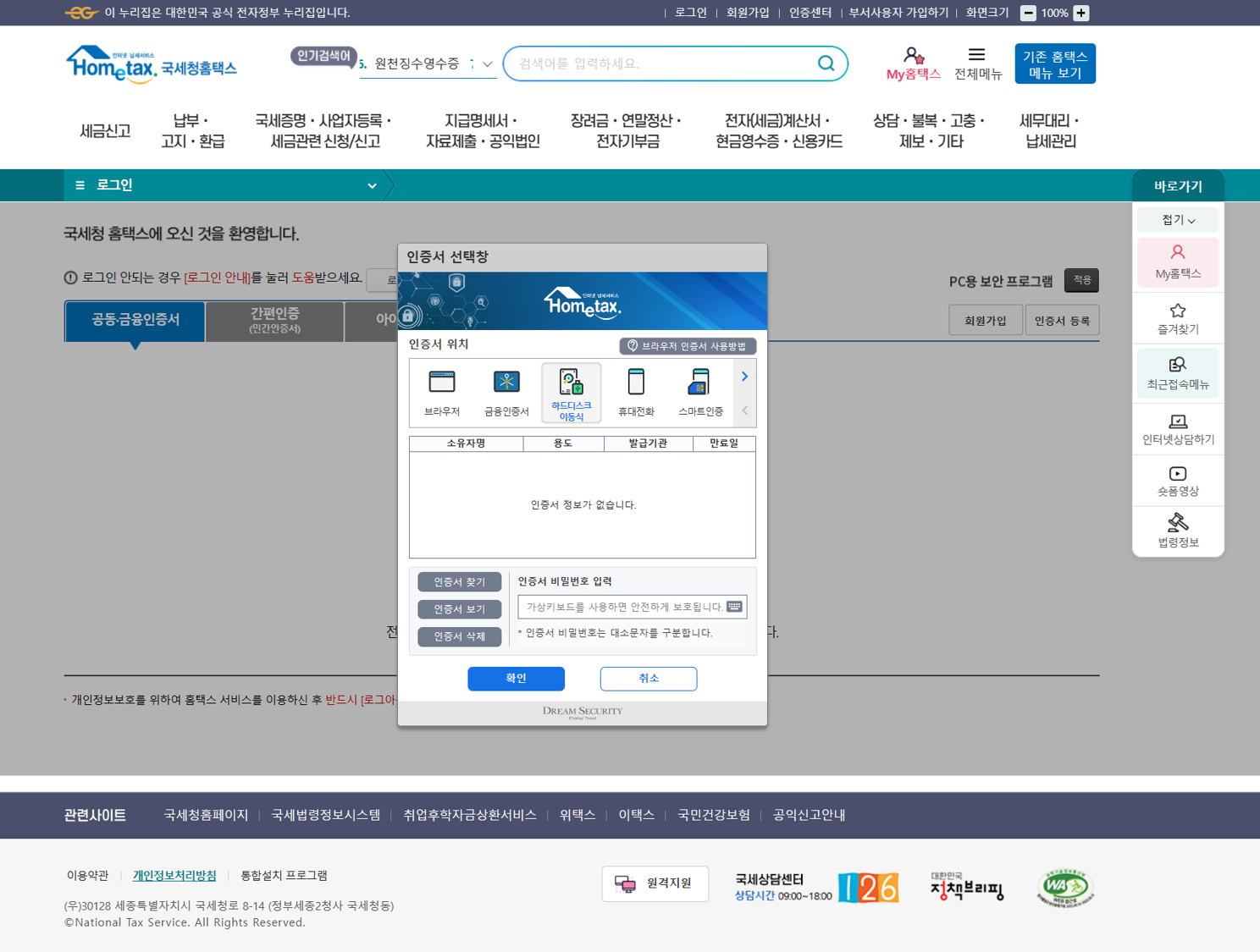 그러면 공인인증서로 로그인이 가능하다. 미리 등록된 인증서가 있다면 로그인하도록 하자.