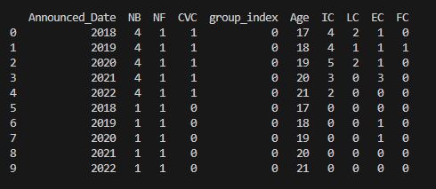 먼저 현재 데이터프레임의 형태를 출력해보자. 엑셀과 동일한 데이터가 들어간것을 알 수 있다. 맨 앞의 열은 인덱스라고 설명을 하였다. 일단 무시하자.