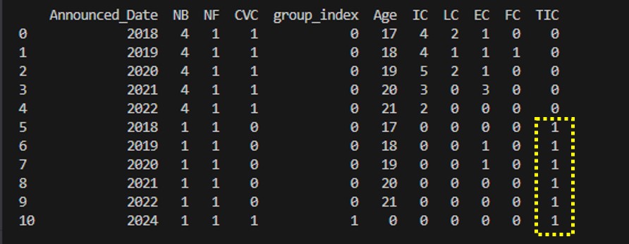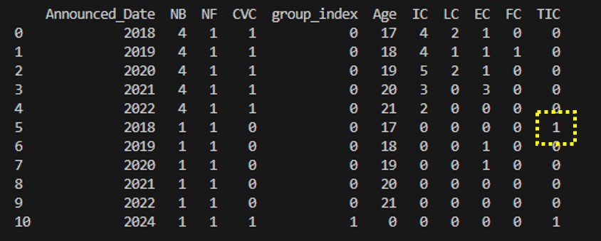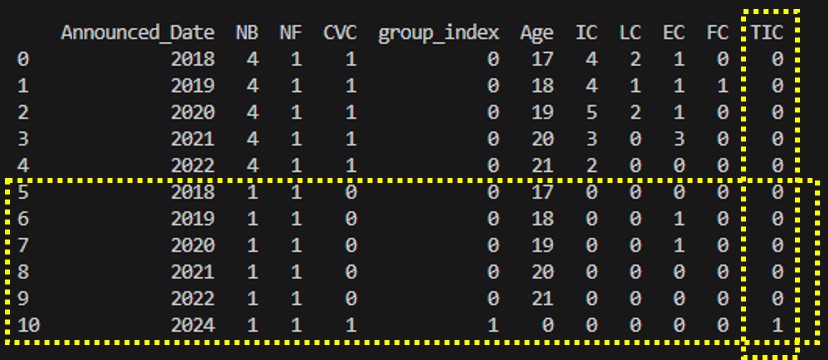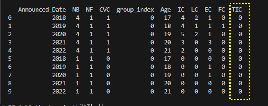우선 5번행의 값부터 변경해보자. 위의 예제에서 df.loc[5, 'TIC'] = 1 코드만 추가해보자