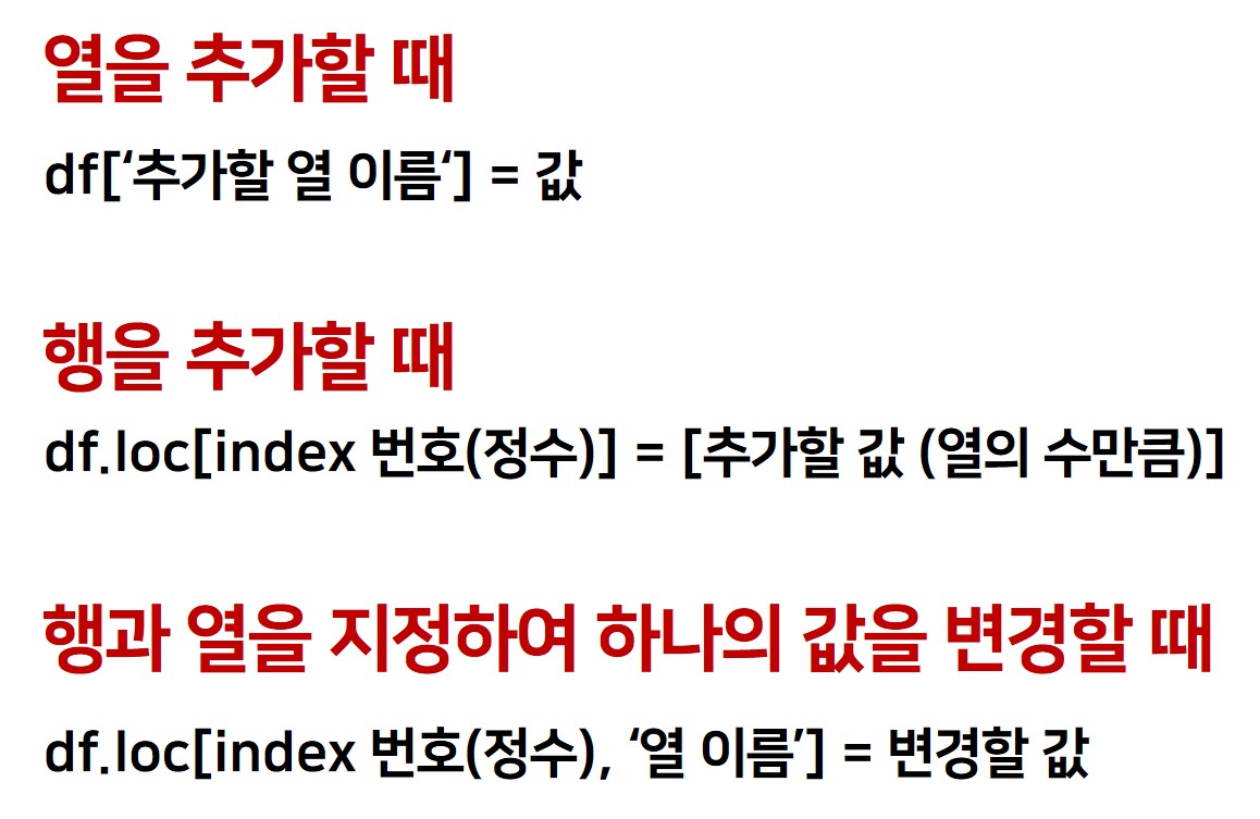 데이터프레임에서 행과 열을 추가하는 방법은 다양하다. 관련 블로그를 검색해보면 다양한 방법으로 행과 열을 추가할 수 있다. 사용방법은 그때그때 상황에 따라 달라질 수 있으나, 처음 데이터프레임을 접하는 사람은 한 두가지 방법만 먼저 확