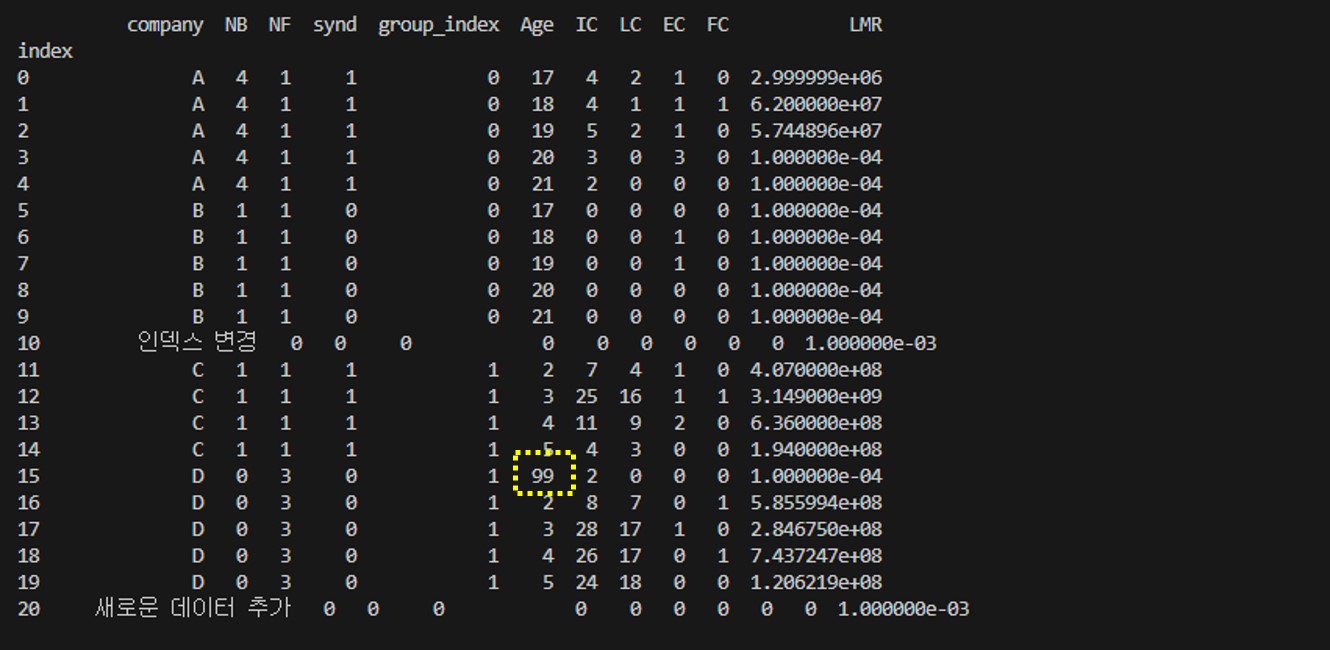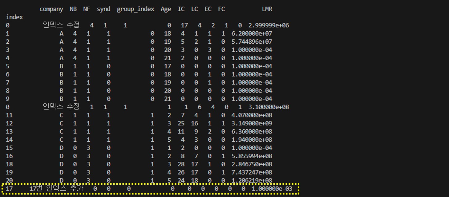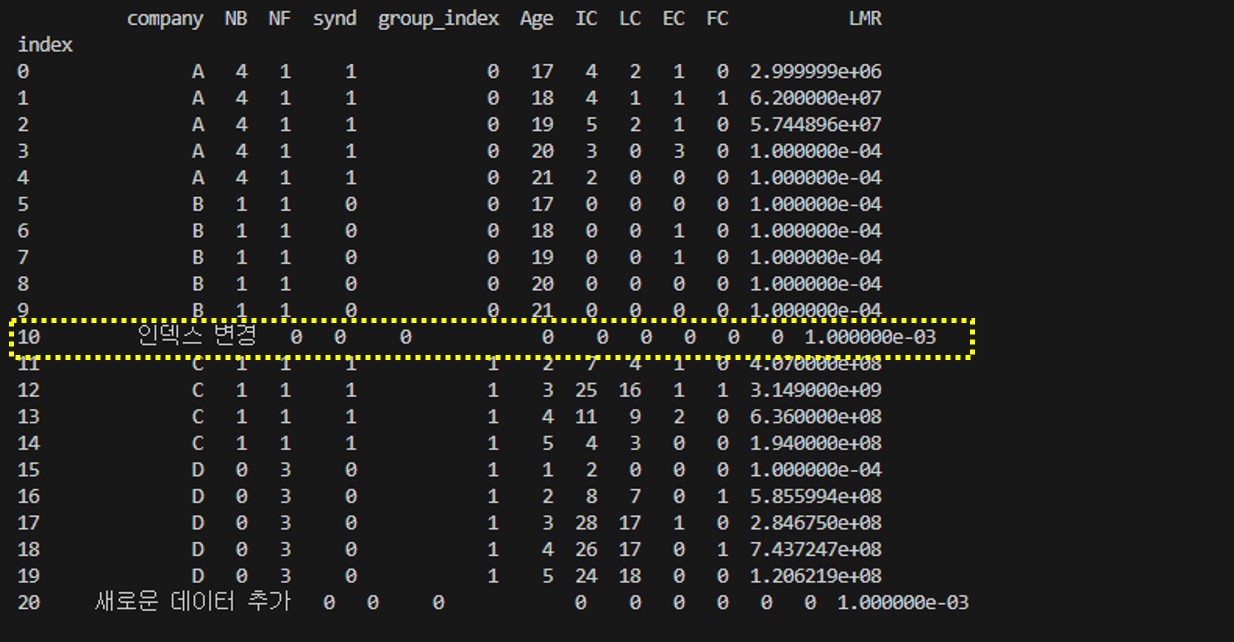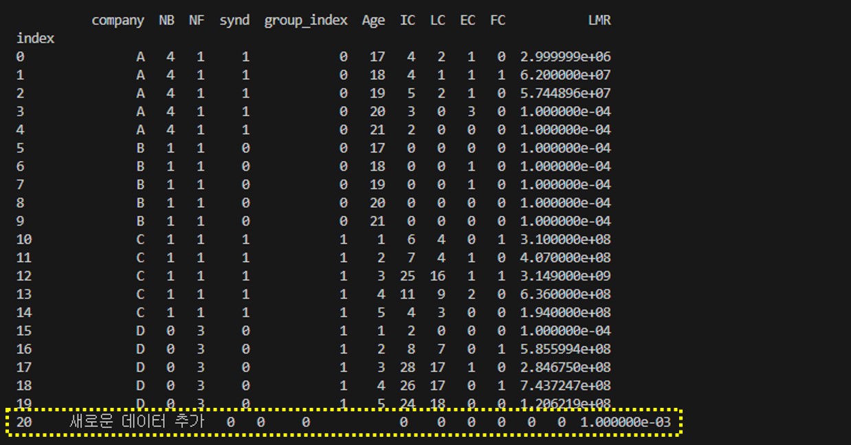 그냥 제일 마지막에 행을 추가해보자 ㅡ.ㅡ... 현재 인덱스 기준 19번까지 있으니 20번을 인덱스를 새롭게 추가해보겠다.