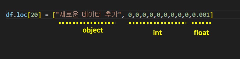 여기서 하나 확인하고 넘어갈 것은 loc로 행을 추가할때 리스트를 만들어서 리스트안에 열의 수만큼 데이터를 넣어줘야 한다. 그리고 데이터는 열의 데이터타입과 일치해야 한다.