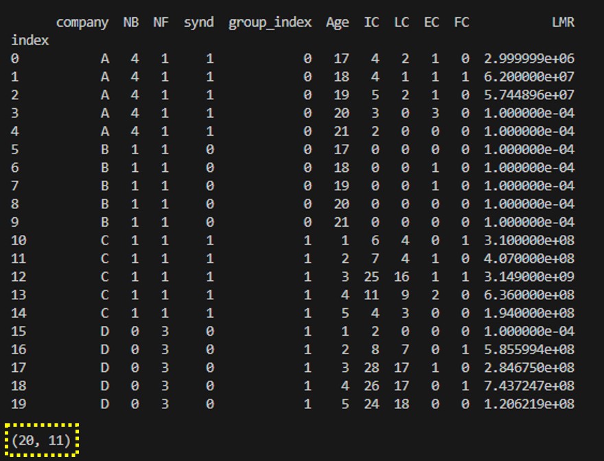 결과는 20개 행, 11개의 열로 나온다. 위에서 열의 개수를 세어보면 11개인것을 알 수 있다.