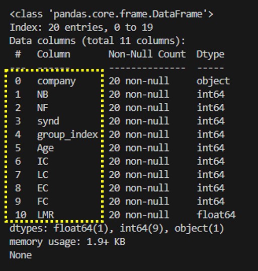 데이터프레임에 대한 기본적인 정보를 제공해준다. 열의 이름과 인덱스, 데이터 수, 데이터타입 등 다양한 정보를 보여준다. 데이터프레임의 구조를 확인할때 많이 사용한다.