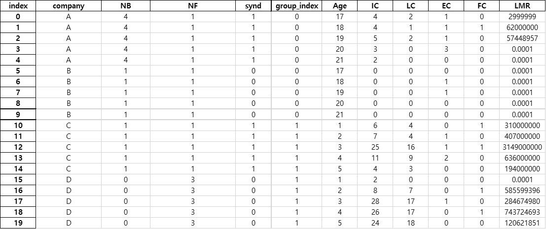 총 20개의 행이 들어 있는 엑셀파일이다. 지난번과 달리 index행이 존재한다.