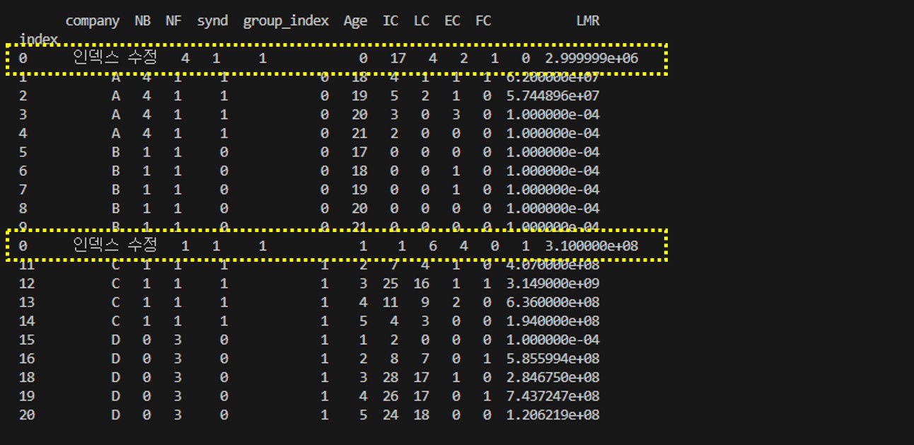 인덱스가 0인 두 행모두 값이 바뀌었음을 알 수 있다. 파이썬에서는 에러가 발생하진 않았지만 데이터를 다루는 입장에서는 에러일 것이다.