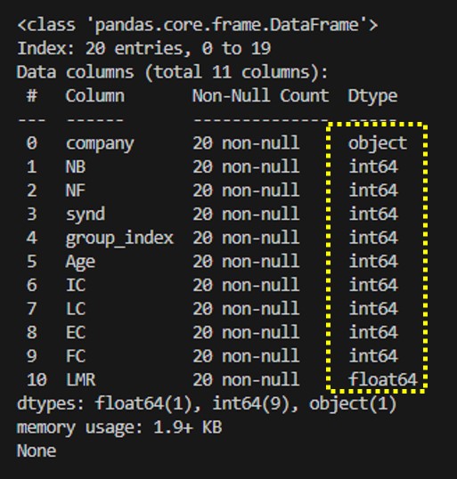 Dtype를 확인해보면 object, int64, float64로 이루어진것을 알 수있다. object는 문자와 숫자가 같이 포함된것으로 그냥 string 이라고 생각하면 된다.
