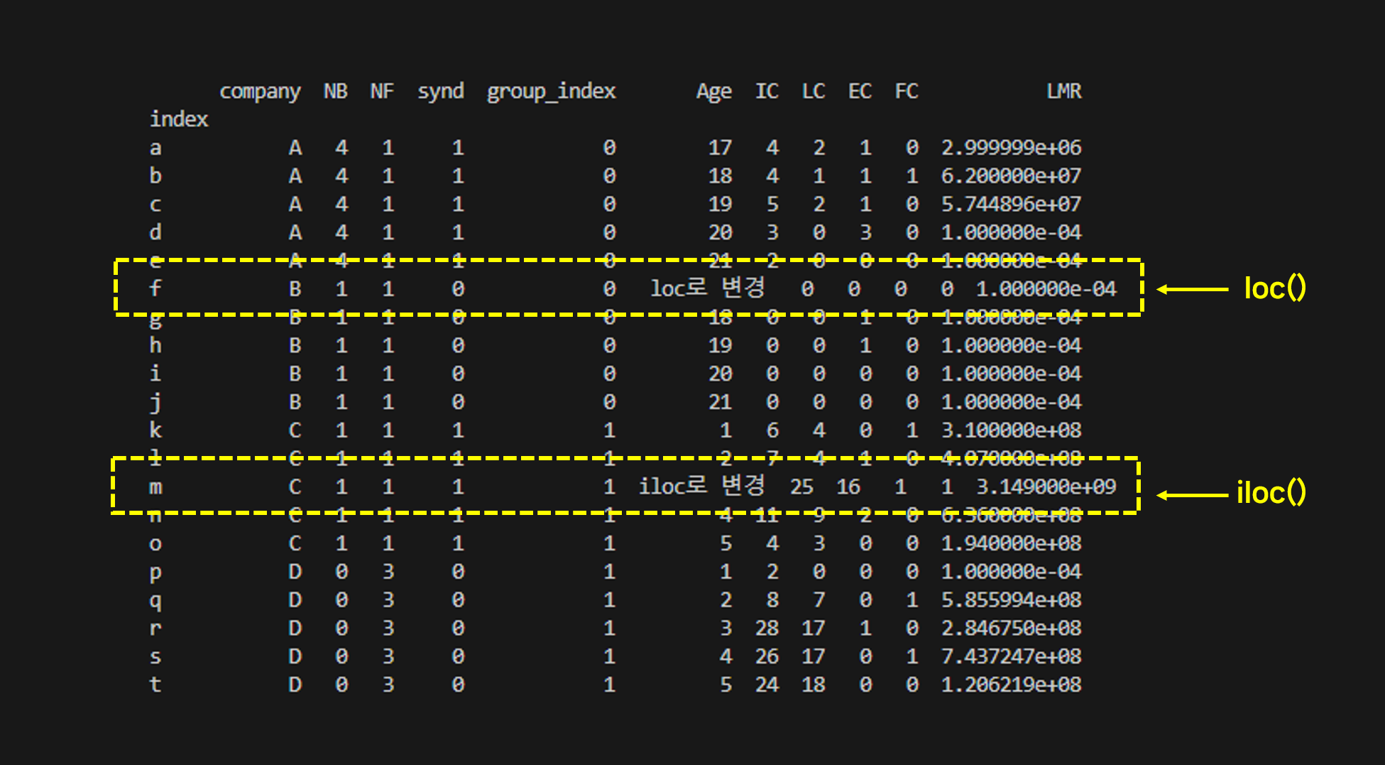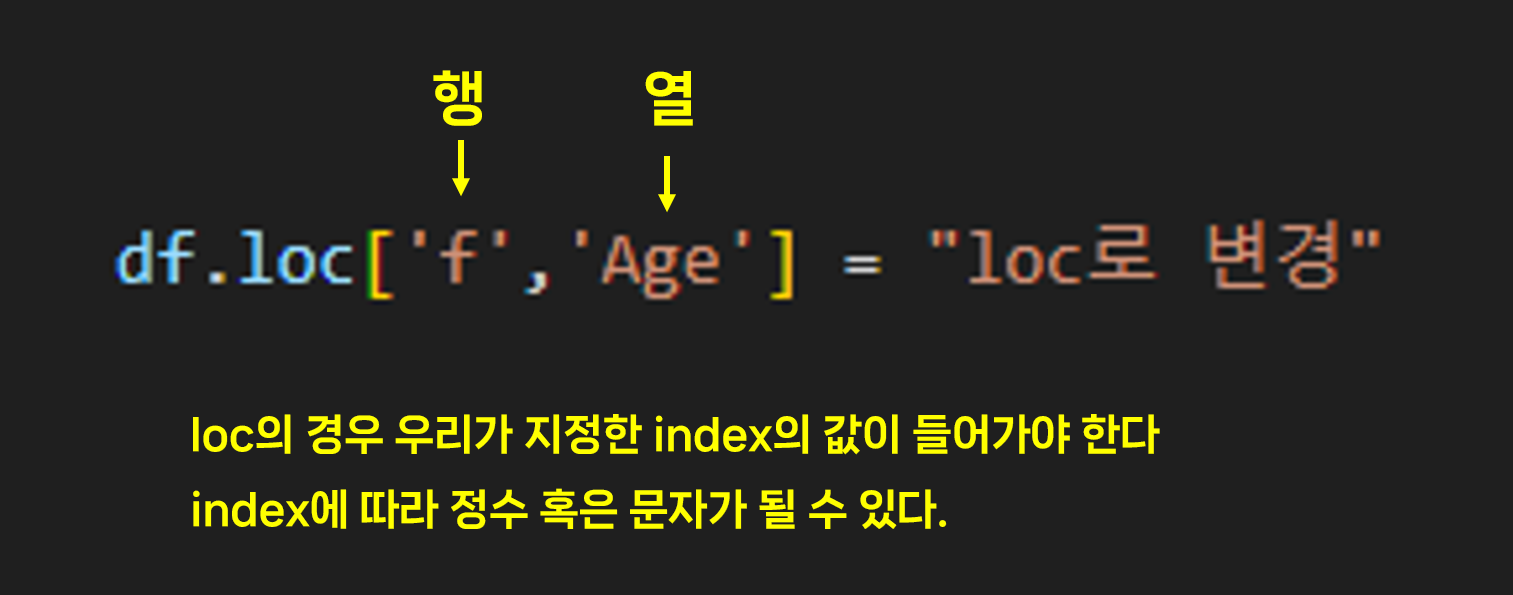 이제 loc와 iloc로 각각 다른 값을 변경해 보겠다.