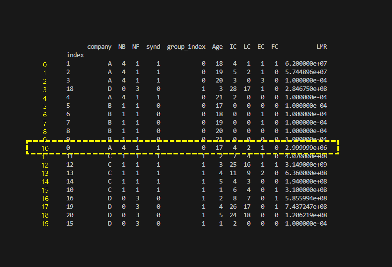 다만 엑셀과 차이가 나는 것은 시작이 1이 아니라 0에서 시작한다는 점이다.