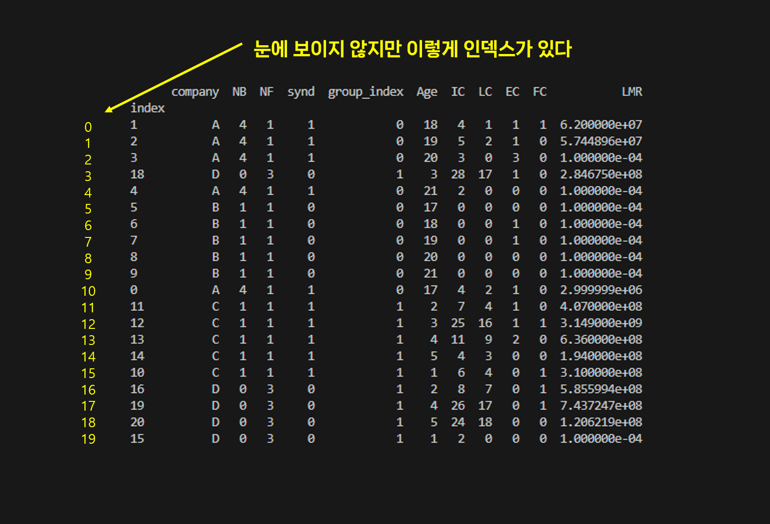 하지만 이 인덱스는 쉽게 말해 인위적으로 만든 인덱스이다. 엑셀에서 처럼 자동으로 할당되는 인덱스는 아니다.