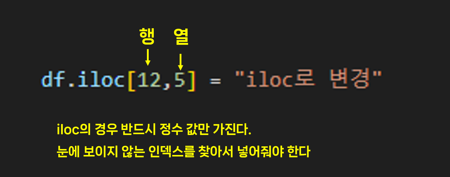 하지만 iloc는 값이 아니라 인덱스 번호로만 접근해야 한다. 이번에는 iloc로 값을 변경해보겠다.