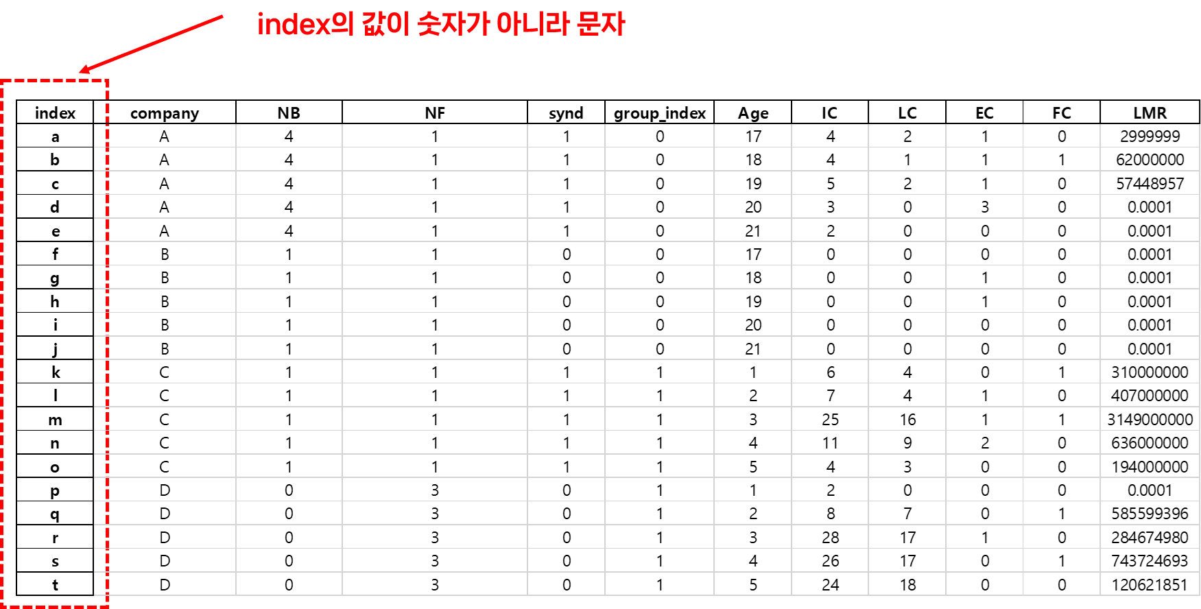 위 파일을 열어봐라. 데이터는 동일한데 인덱스가 숫자가 아니라 문자로 되어 있다.