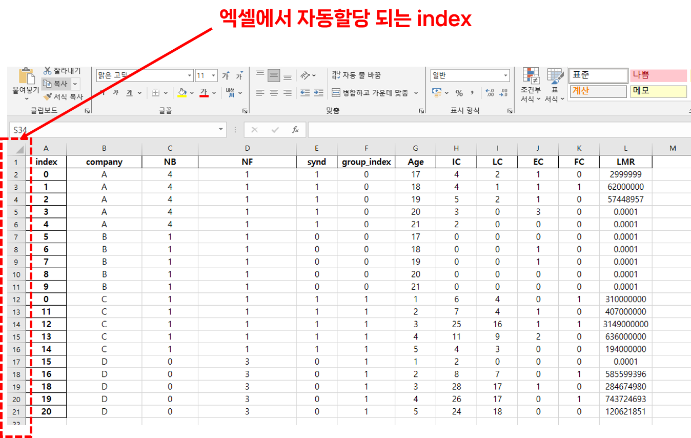 이건 바로 엑셀 프로그램에서 자동으로 할당 되는 인덱스이다. 우리가 중간에 행을 삭제하더라도 저 인덱스는 항상 오름차순으로 정렬되며 일정하게 유지된다.즉, 엑셀 프로그램에서의 기준이 되는것이라 볼 수 있다.