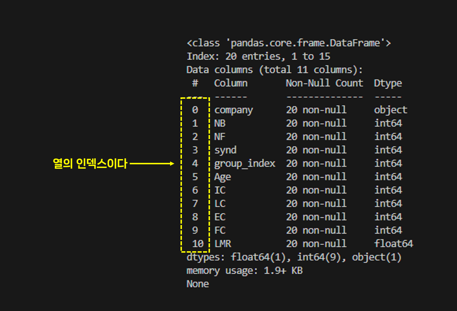 행의 경우 10이고 열의 경우 5이다. 열의 인덱스 번호를 알기 위해서는 df.info()를 통하여 확인 할 수 있다.