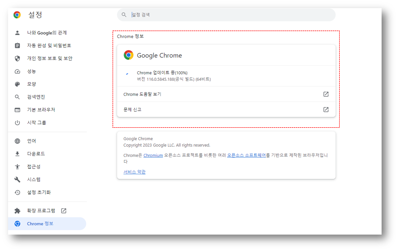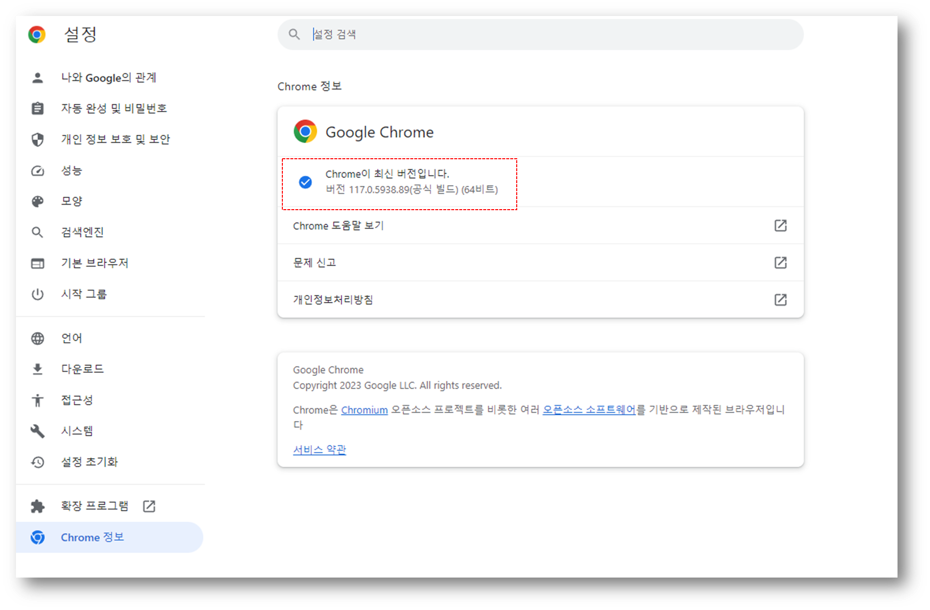그러면 아래와 같이 자신의 크롬 버전이 나타날 것이고, 최신 버전이 아니라면 자동으로 업데이트 될 것이다.