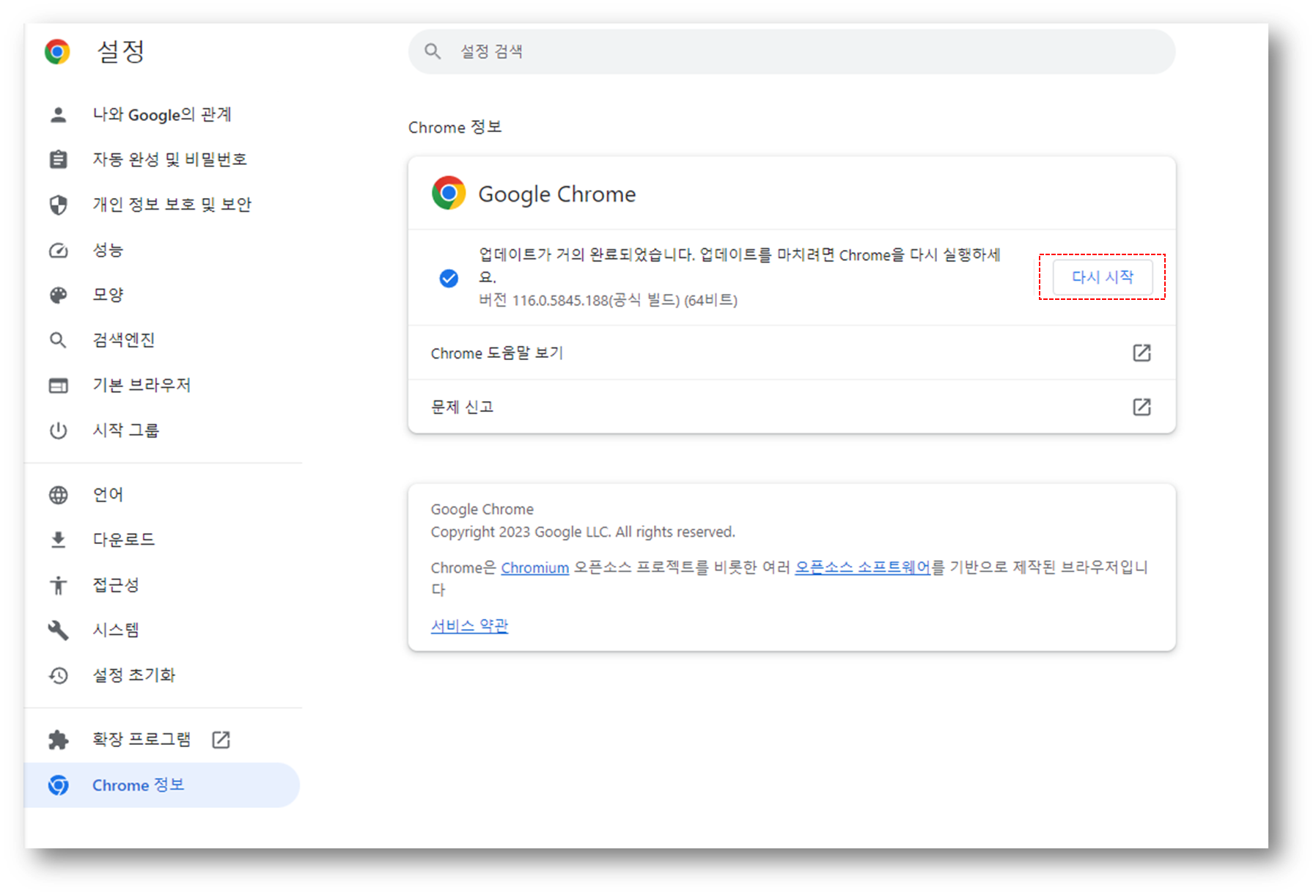 업데이트가 완료되면 다시 시작 버튼을 눌러 업데이트를 완료하자.