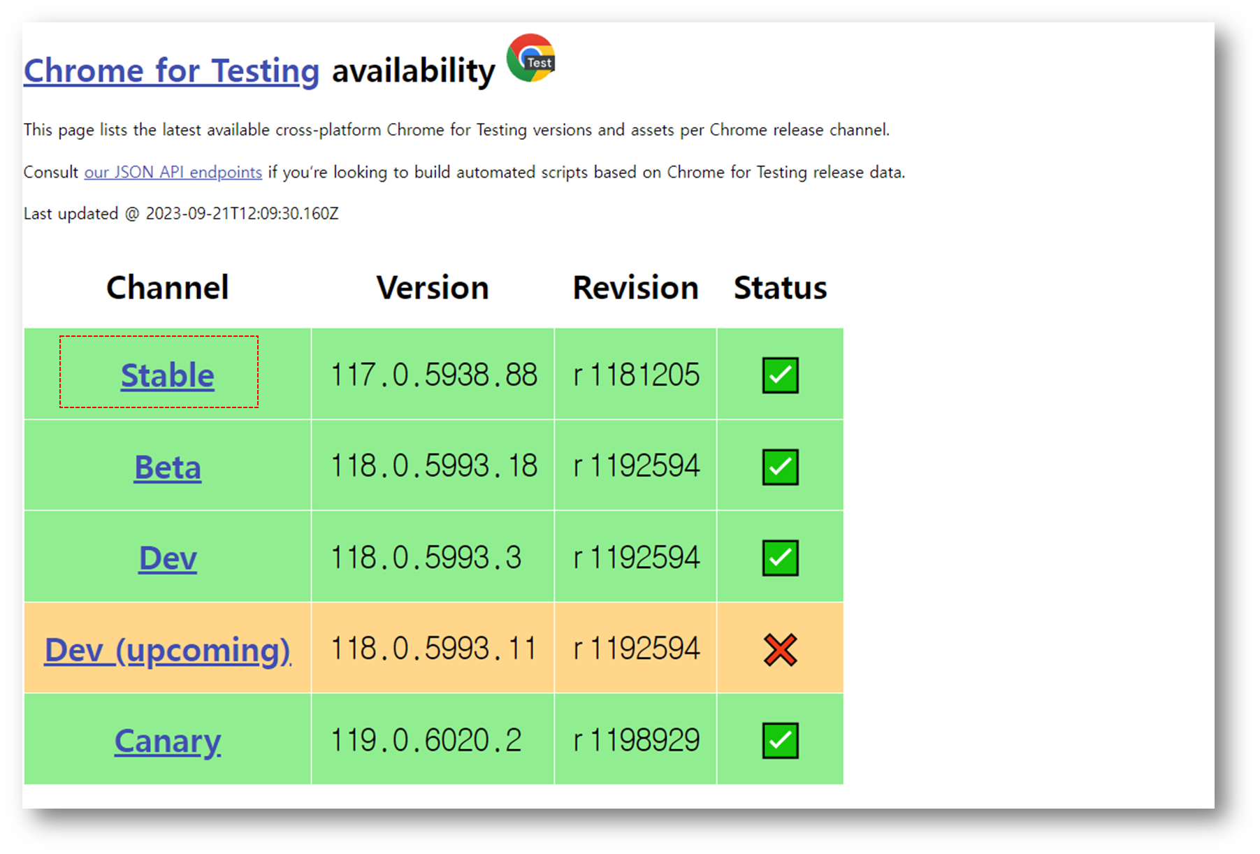 다시 크롬 드라이버 다운로드 페이지로 돌아가자. 첫번째 줄 Current Releases에 보면 the chrome for Testing availability dashboard 라는 링크가 보일 것이다. 이 링크를 클릭하여 dashboard로 들어가자