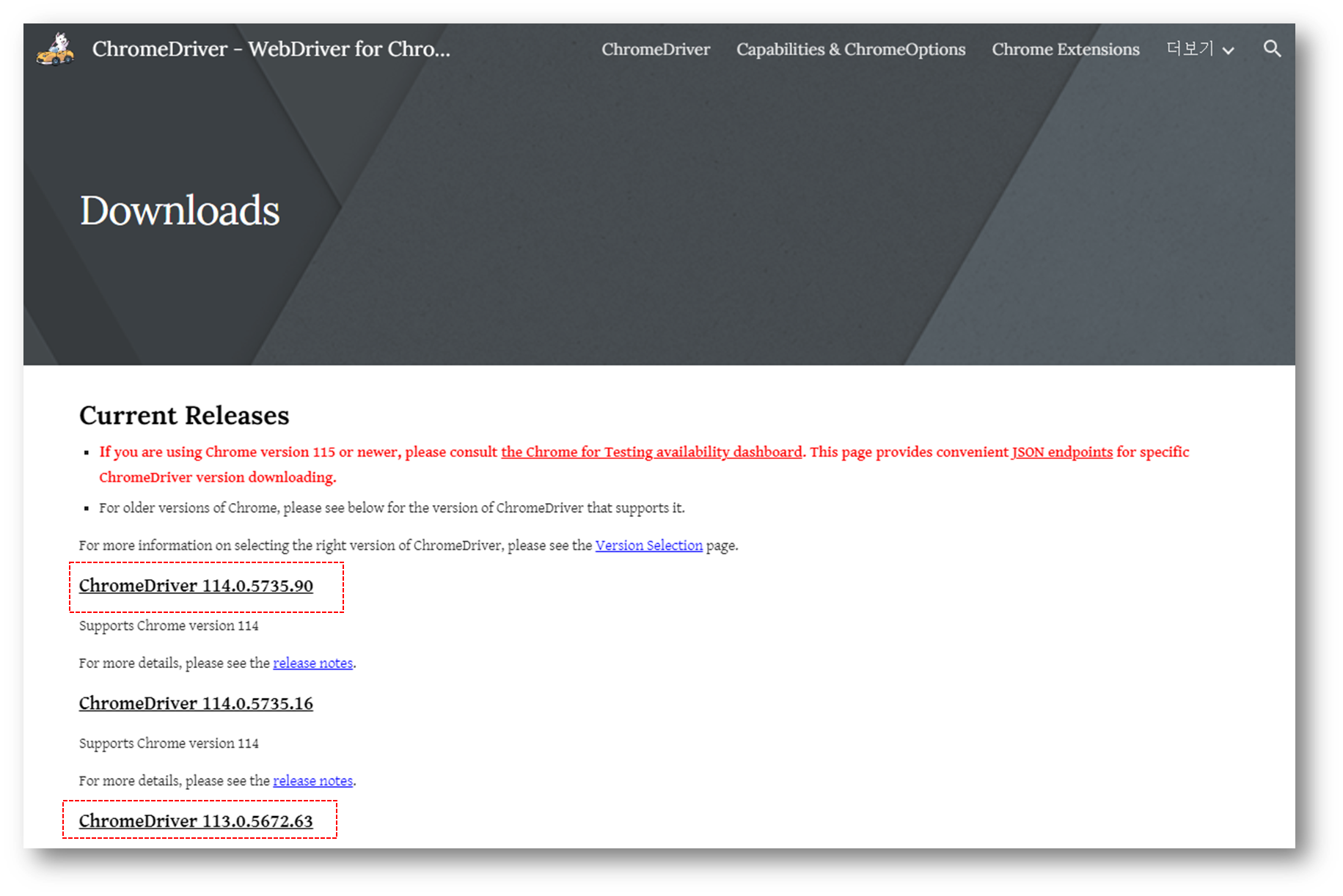 Current Releases If you are using Chrome version 115 or newer, please consult the Chrome for Testing availability dashboard. This page provides convenient JSON endpoints for specific ChromeDriver version downloading. For older versions of Chrome, please se