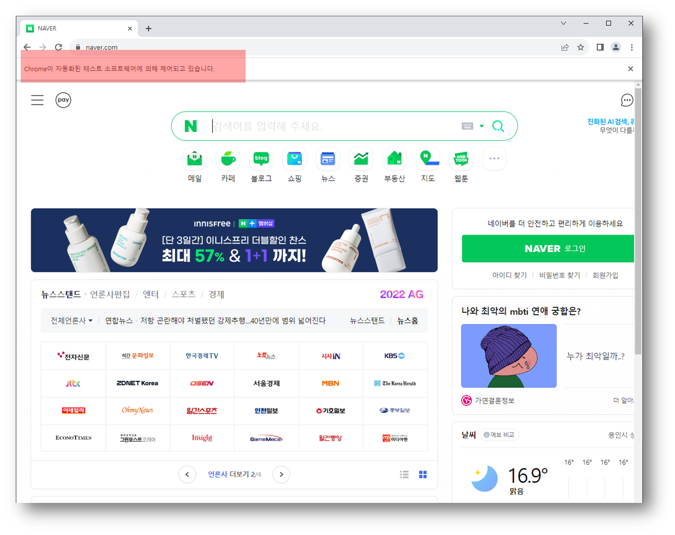 크롬 드라이버로 실행하였을 경우 특징은 "Chrome이 자동화된 테스트 소프트웨어에 의해 제어되고 있습니다" 라는 문자가 나타난다.