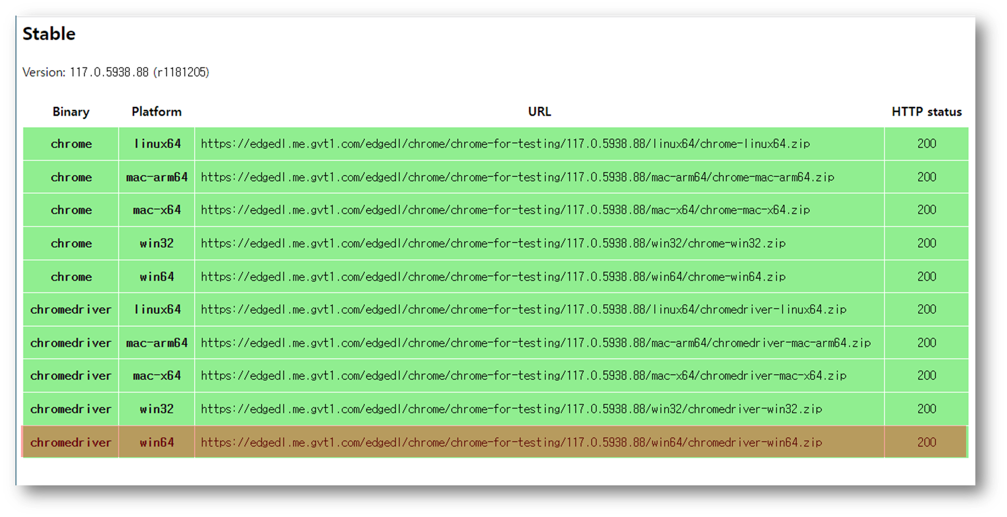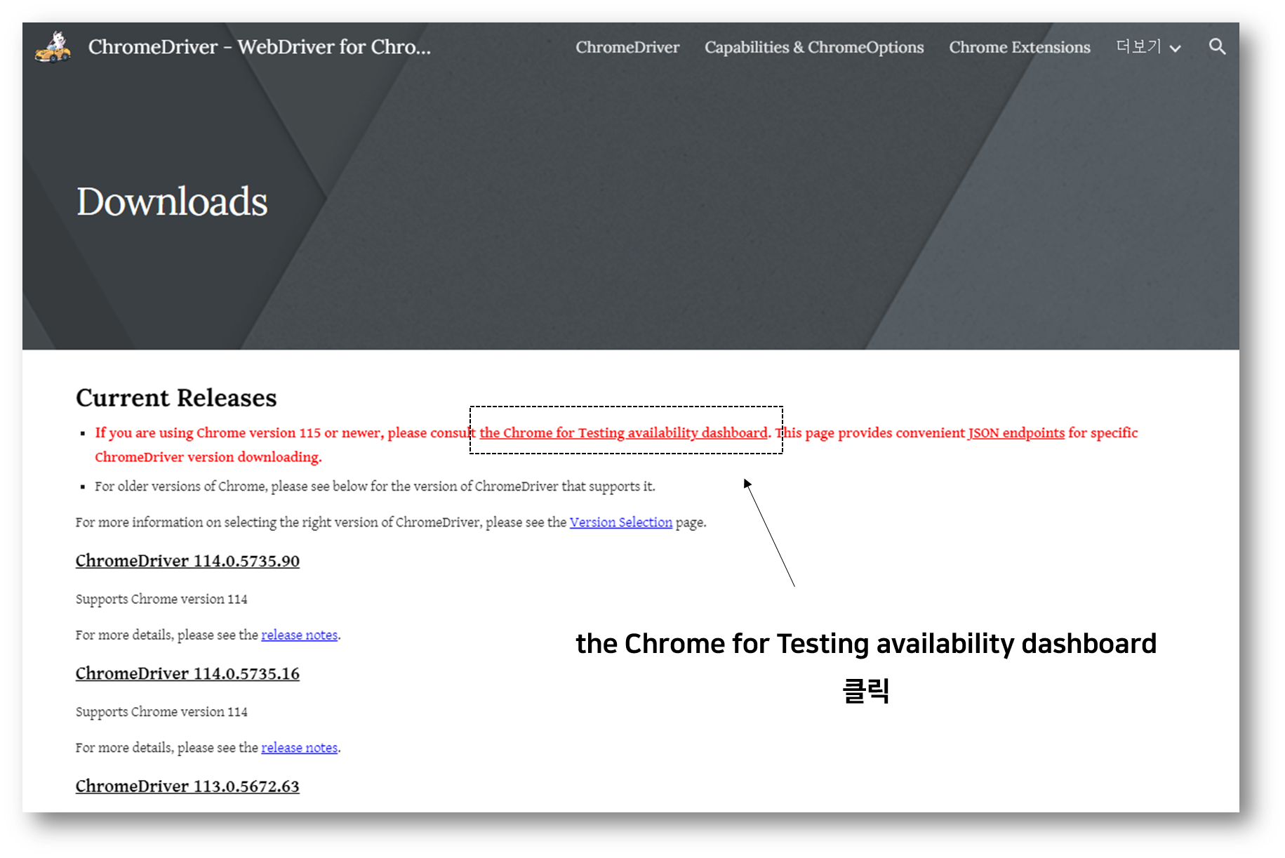 다시 크롬 드라이버 다운로드 페이지로 돌아가자. 첫번째 줄 Current Releases에 보면 the chrome for Testing availability dashboard 라는 링크가 보일 것이다. 이 링크를 클릭하여 dashboard로 들어가자