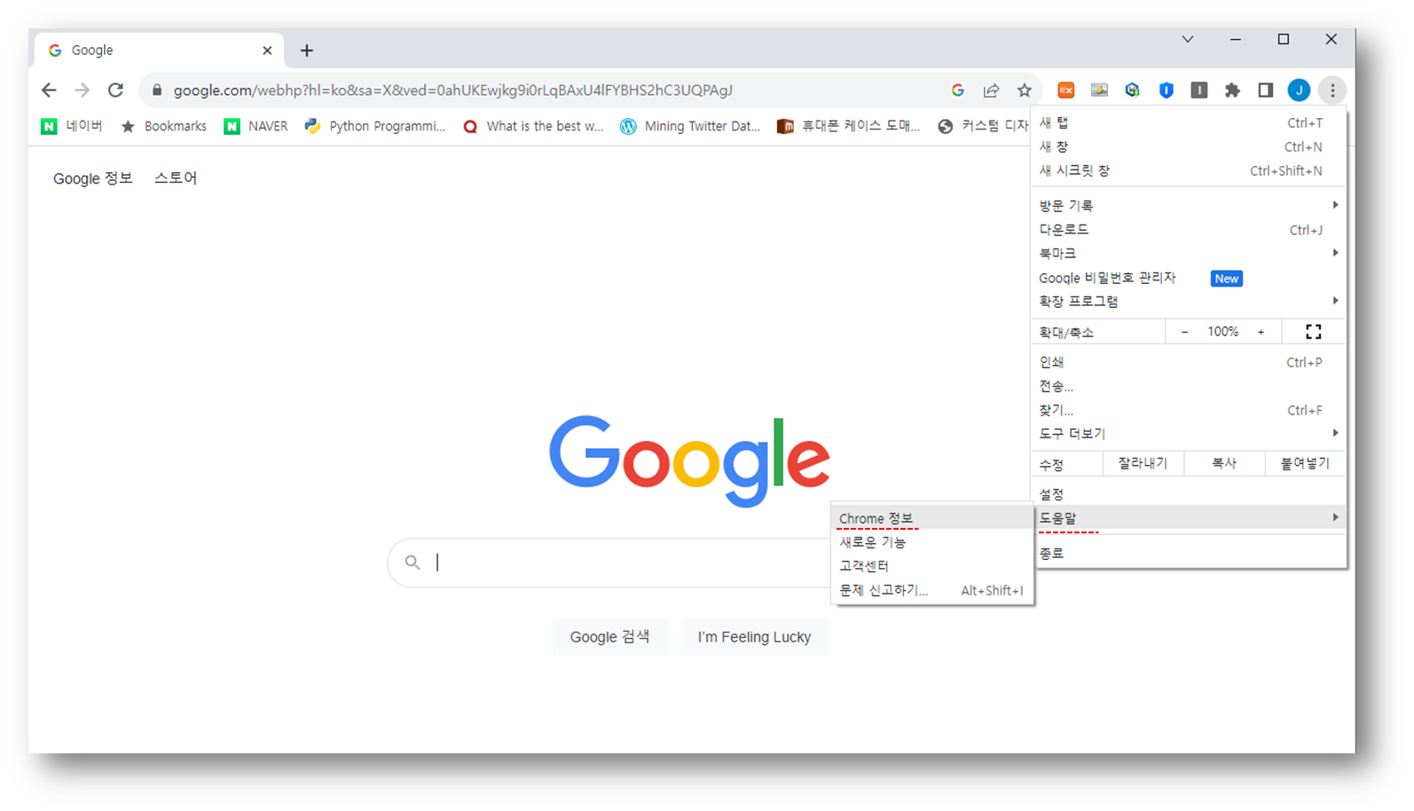 세로줄입표를 클릭하여 도움말 - Chrome 정보를 클릭하자.